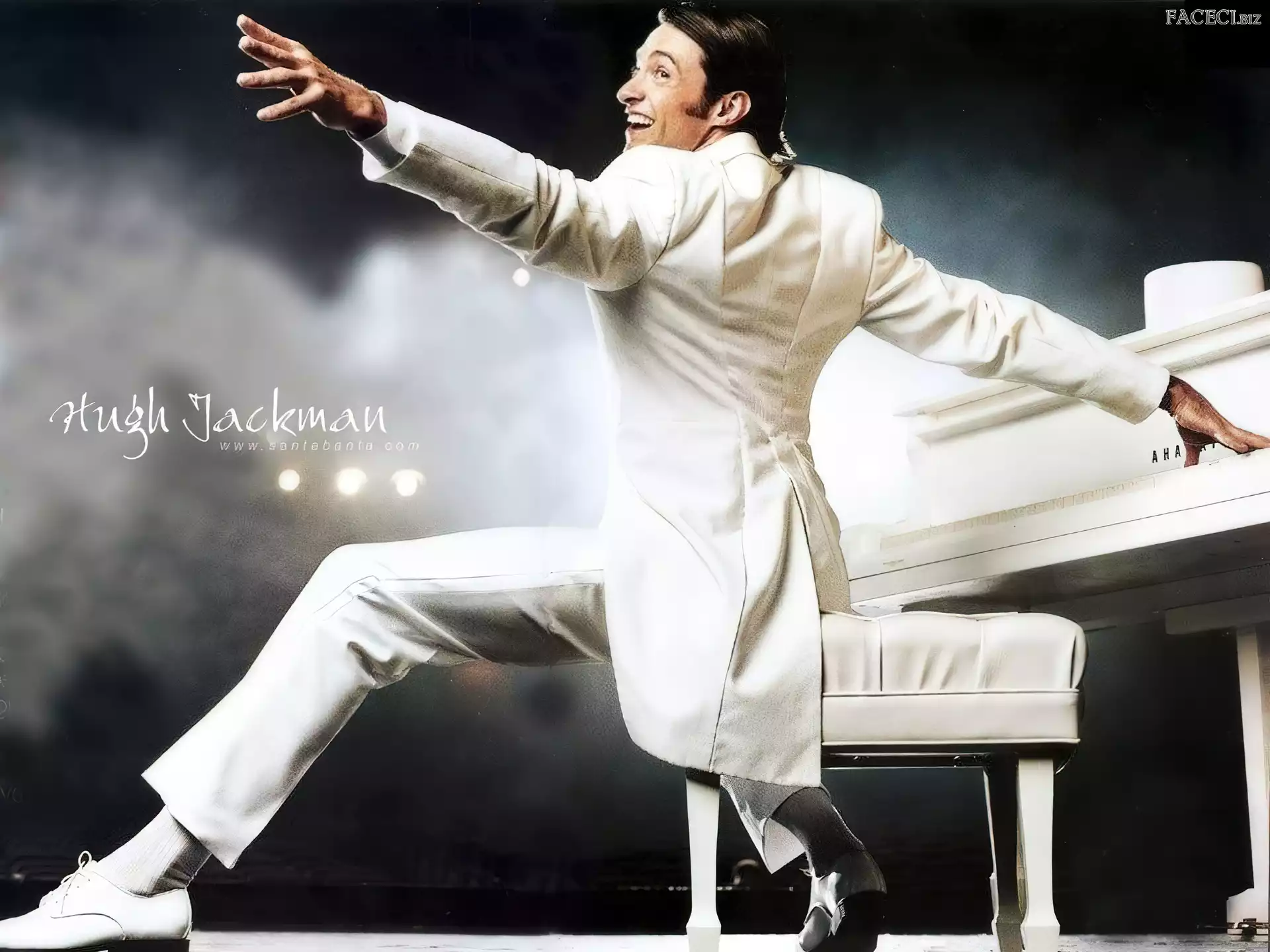 fortepian, Hugh Jackman, biały strój